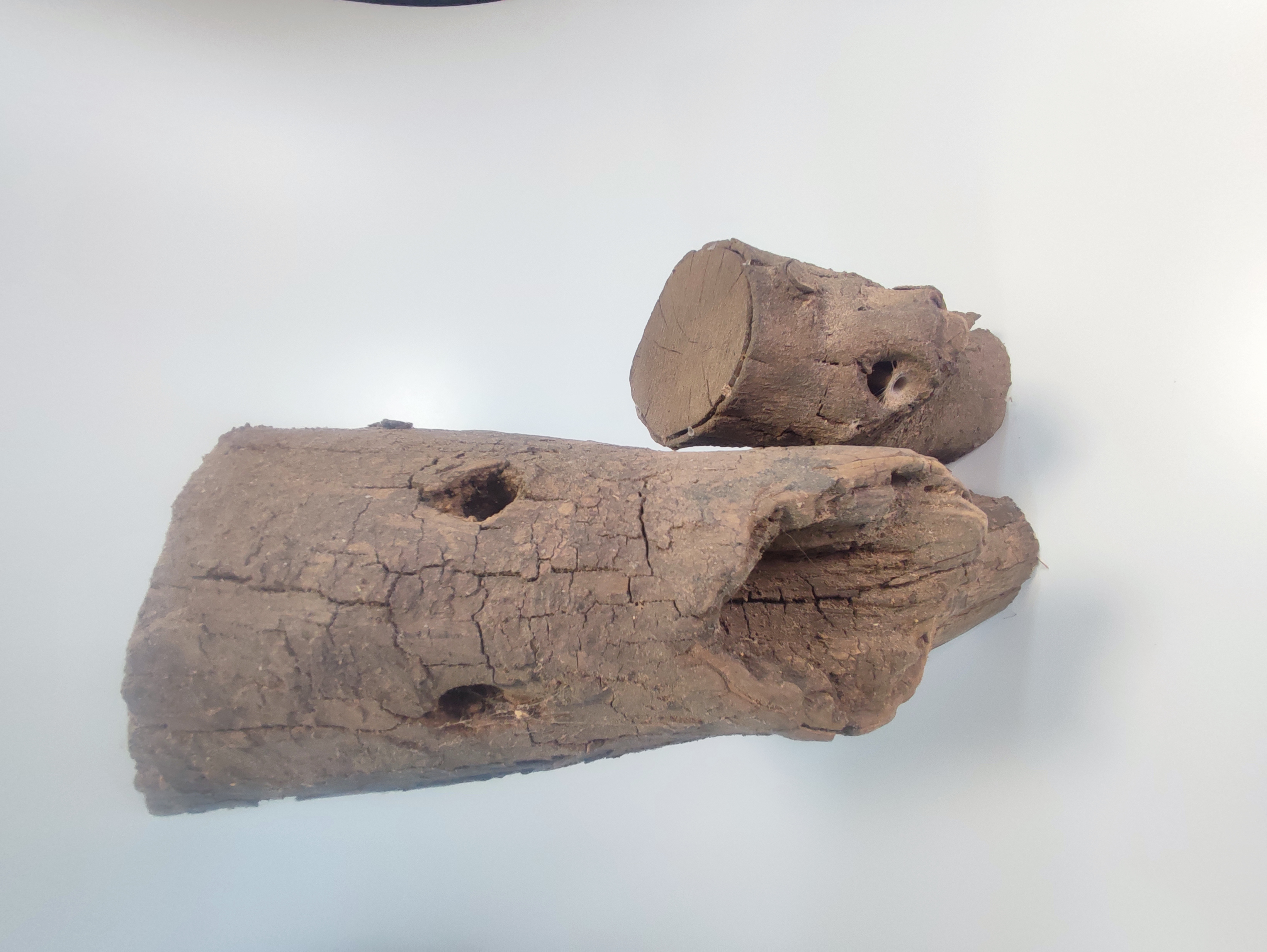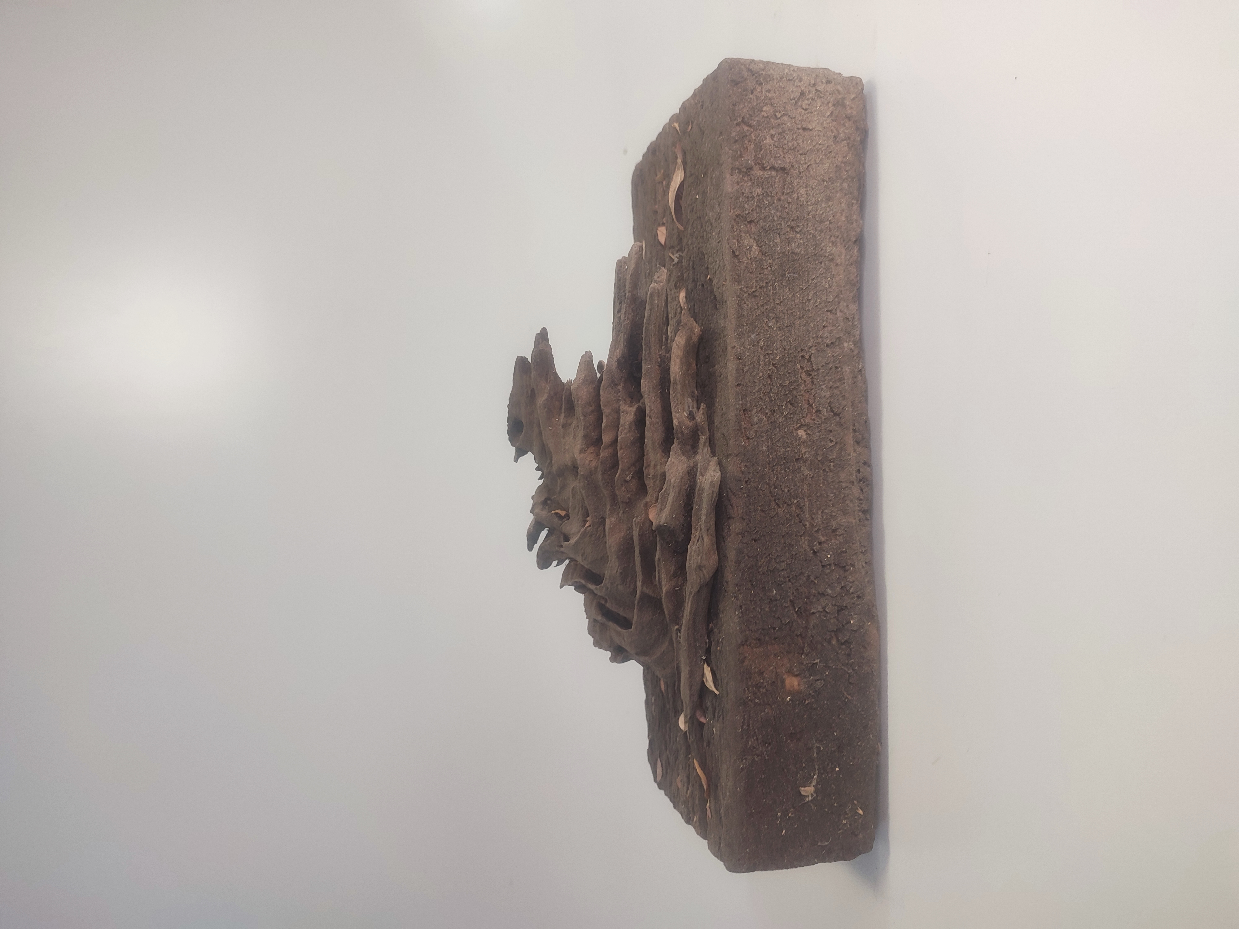 Masa oscura y rugosa, de superficie quebrada y compacta. La pieza se alza sobre dos varillas metálicas, como suspendida en el aire. La textura recuerda un tejido petrificado, endurecido por el tiempo, con pliegues y cavidades que evocan materia cerebral. El volumen transmite densidad, concentración, una fuerza vital contenida en su interior, como si el árbol hubiera comprimido su memoria en un único fragmento.